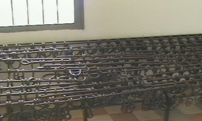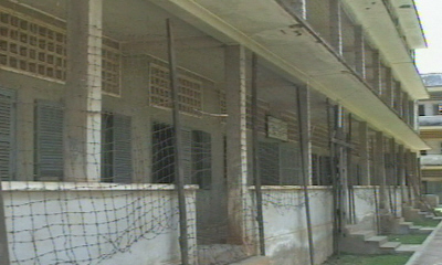 Tuoll Sleng. In het voormalige schoolgebouw was de geheime dienst van de Rode Khmer gevestigd. Er zijn celletjes van 1,50 x 0,60 meter in de lokalen gemetseld of getimmerd. De gevangen zaten vast aan de muren met stalen beugels. De breedte van de cellen is aan de beugels te zien; van de zijkant ingeschoven overlapten ze 8 cellen over de breedte, voeten of armen zaten vast aan de beugels. Martelen was een dagelijks gebeuren.