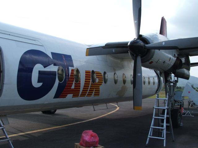 Met deze fors gedeukte Fokker F27 vliegen van Bali naar Lombok; binnendeuren sloten slecht