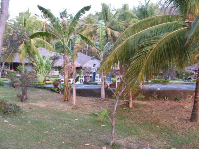 Tuin, terras bij het zwembad, zwembad en enkele bungalows