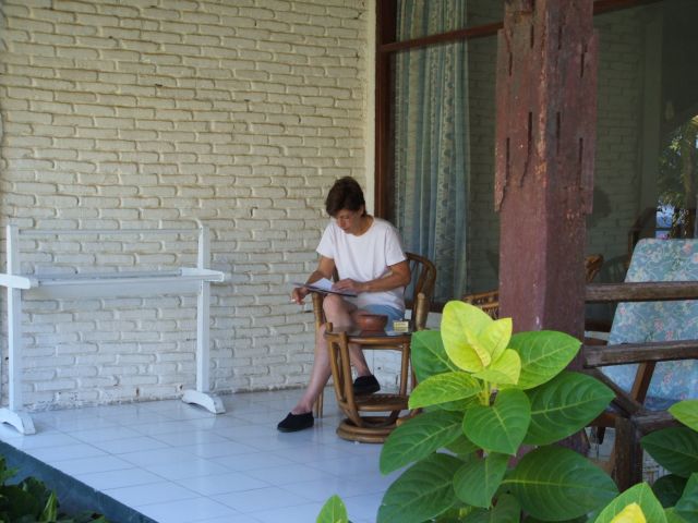 Ali, uit de zon, op de waranda van onze bungalow