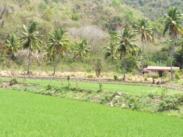 Werk op de sawahs; rechts ploegen met de karbouw.