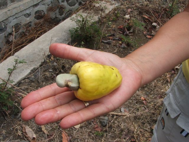 De cashewnoot. Zit in het dingetje bovenop (steeltje zeg maar) en niet in het gele appeltje.
