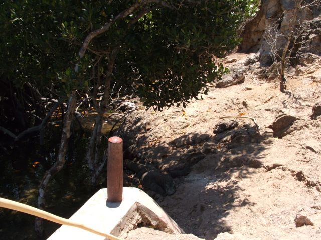 Rinca. In de schaduw (waar anders) ligt een varaan.