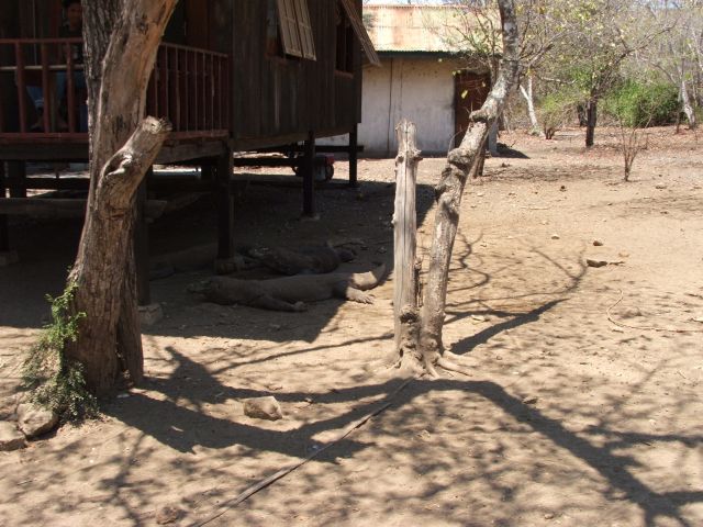 In de schaduw van het voorste huis ligt er een. Een poot en stuk staart zijn zichtbaar (net naast de boom).