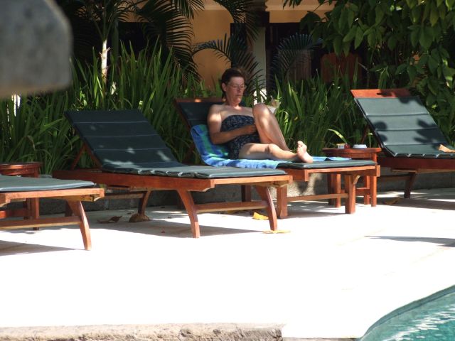 Ali in de schaduw bij het zwembad